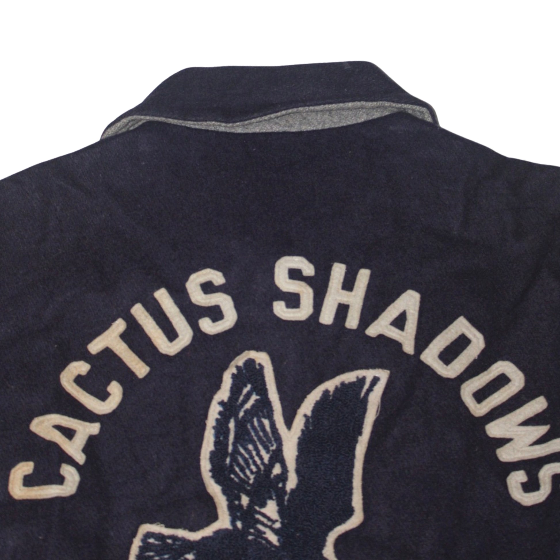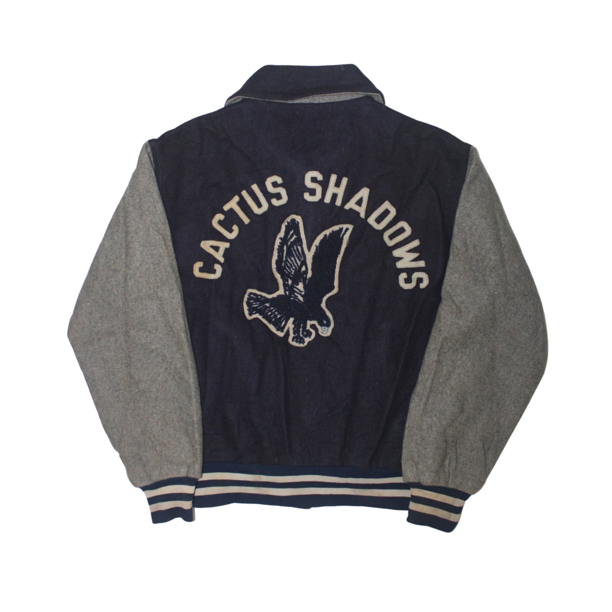 Details: Navy wool body with grey wool sleeves, snap-button front, stitched name “Jennifer ’86” on chest, angled welt pockets, ribbed cuffs and hem with cream striping, large “CACTUS SHADOWS” arched felt lettering with bird graphic on back, structured varsity silhouette