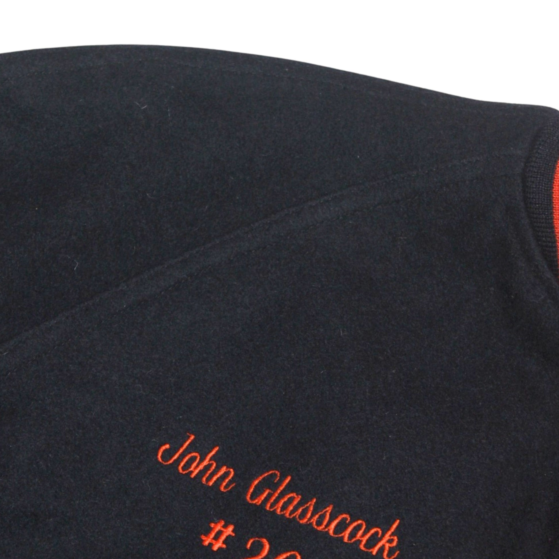 Details: Black wool body, snap-button front, striped ribbed collar/cuffs/hem in black and orange, large orange chenille “G” patch on chest with stitched detailing, embroidered name “John Glasscock #20” on front, oversized “Glasscock” chenille script across back, leather-trimmed welt pockets, fully lined, classic heavyweight varsity construction