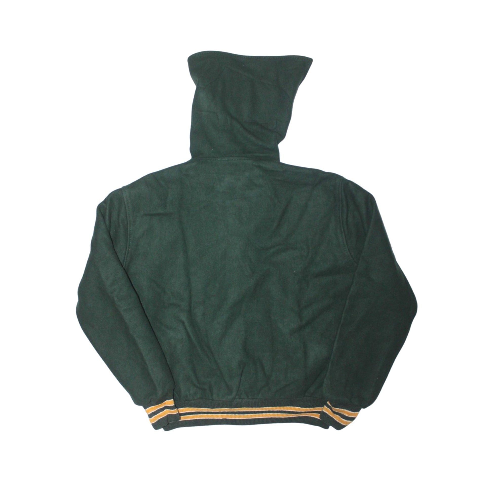 Details: Deep green wool varsity jacket with attached hood, large Kawbonic Valley felt graphic inside hood, snap-button front with contrast yellow snaps, leather-trimmed welt pockets, ribbed cuffs and hem with yellow striping, embroidered name detail on sleeve, plain back, quilted interior lining