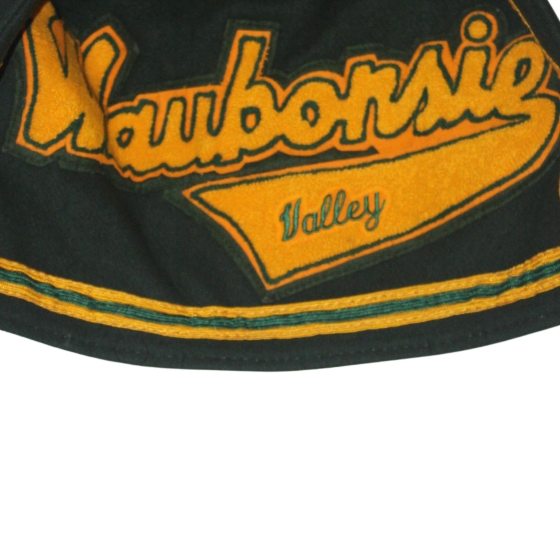 A standout American varsity jacket featuring a rare built-in hood with bold Kawbonic Valley felt lettering hidden inside. Made by Game Sportswear in the USA, this piece reflects classic late-20th-century teamwear—heavyweight, functional, and personalized, with design details meant to be both practical and expressive.