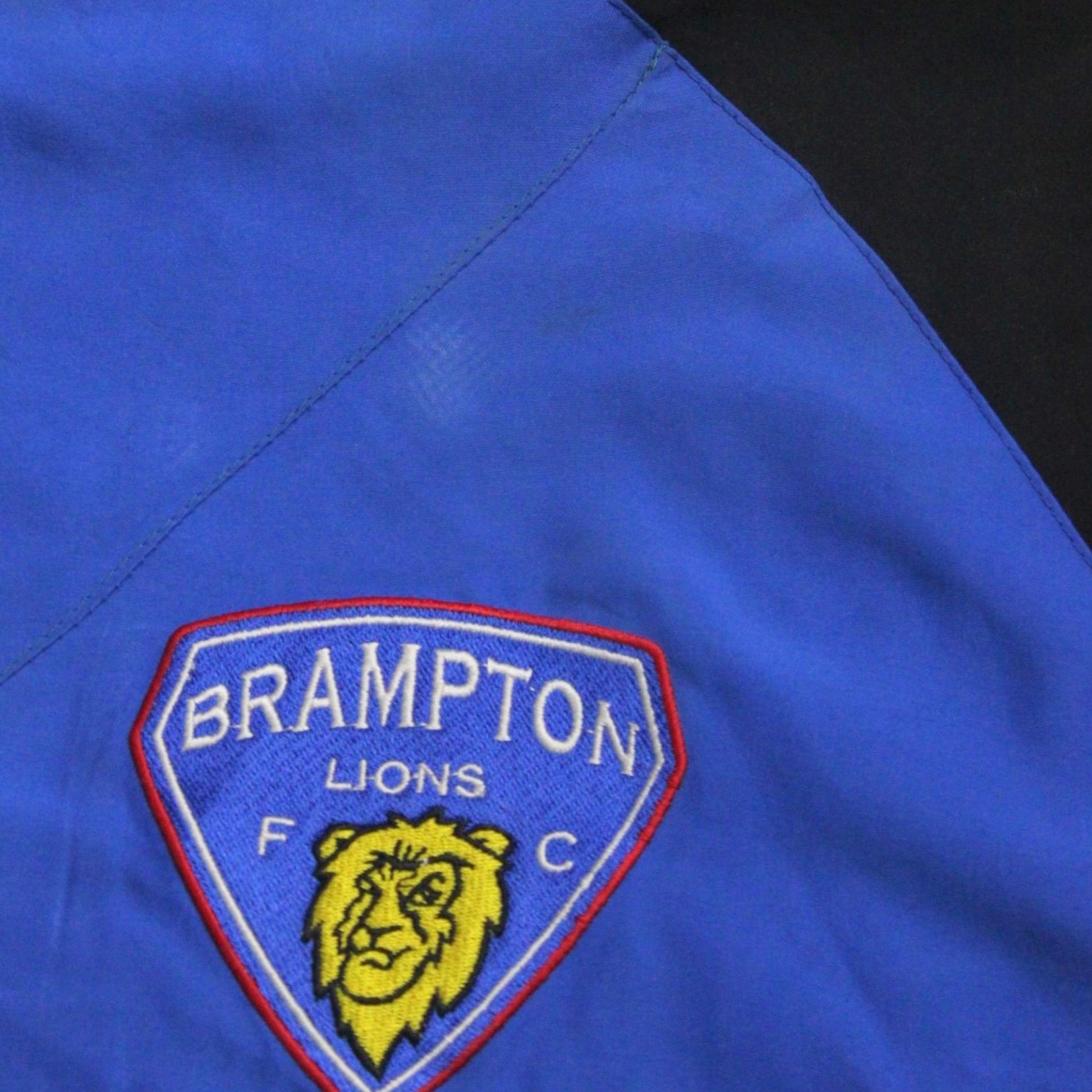 Details: Blue full-zip track jacket with black contrast shoulder and sleeve panels, Brampton Lions FC embroidered chest crest, Ontario Athletics maple-leaf sleeve patch with star detailing, high stand collar, elastic cuffs and hem, small cyclist embroidery detail, plain back
