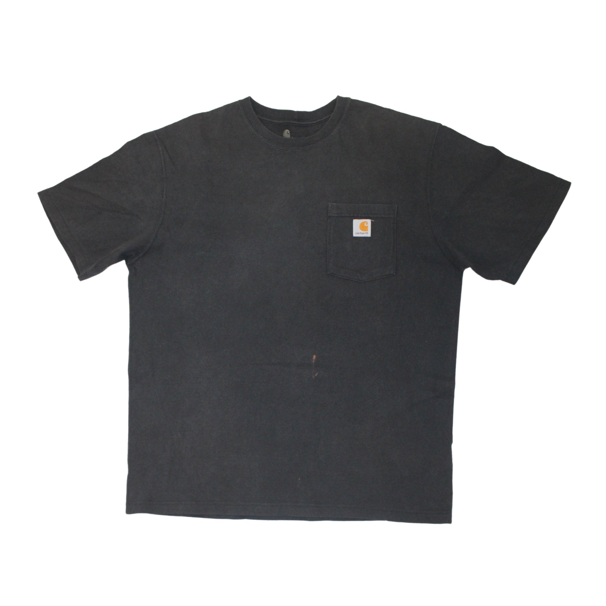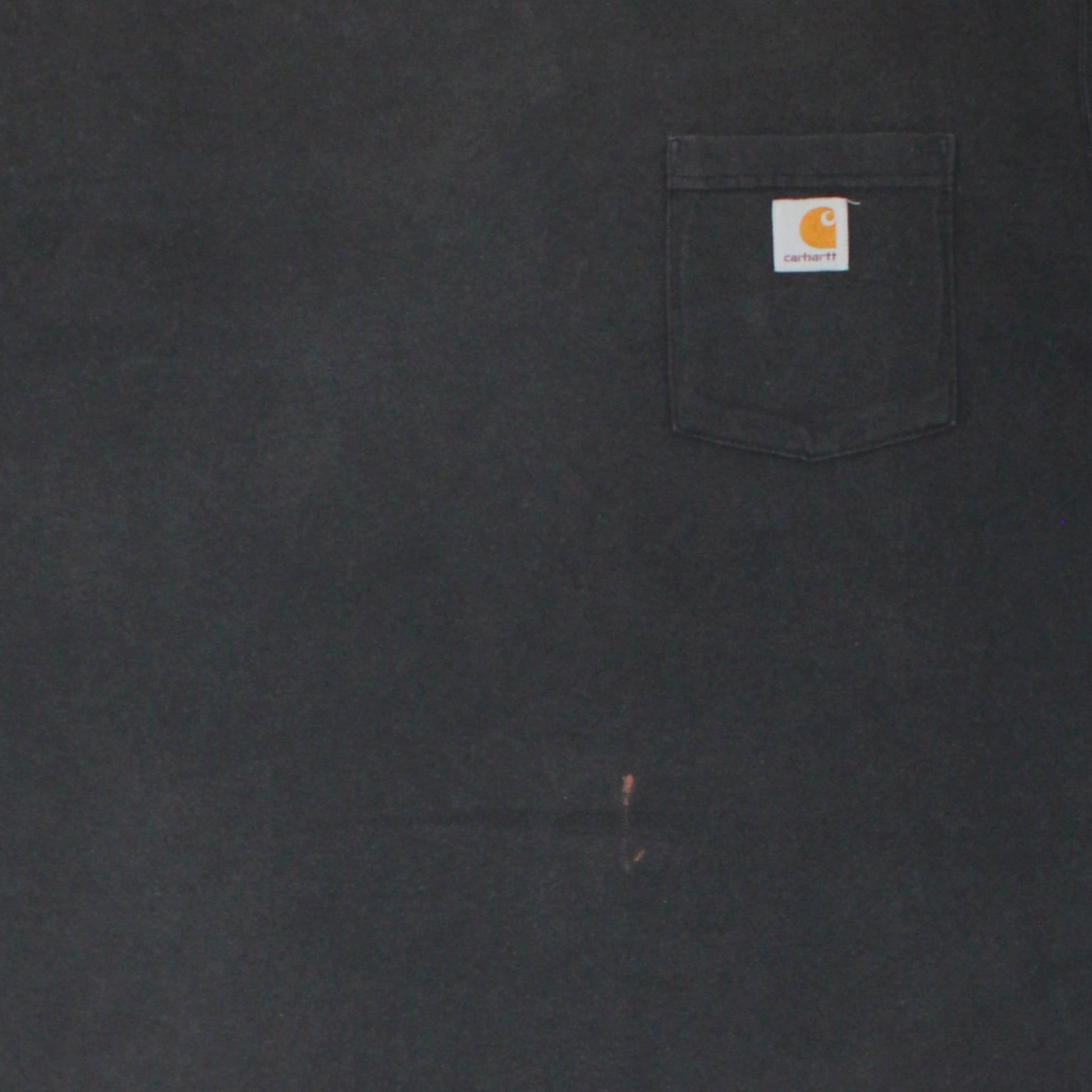 Workwear classic — heavyweight black Carhartt with signature chest pocket and logo patch. Naturally sun-faded with a small paint mark that adds to the lived-in charm.