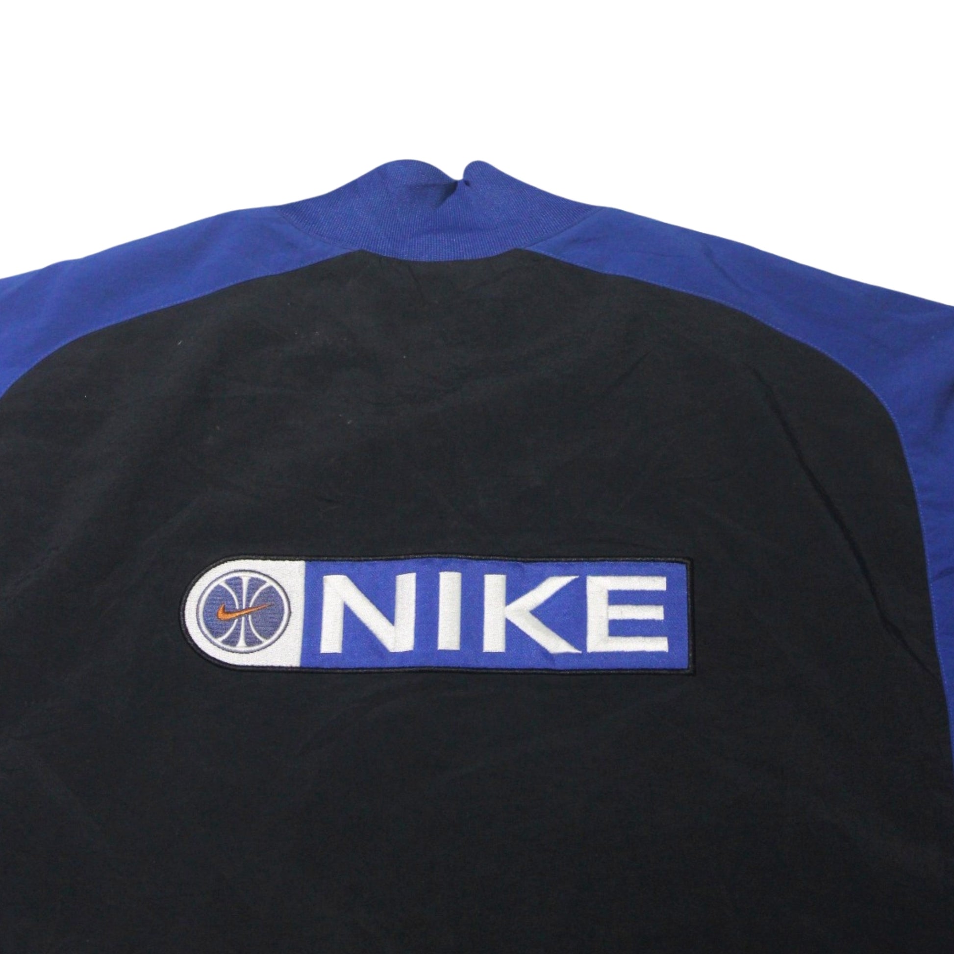 A clean early-2000s Nike zip-up jacket featuring a bold black, royal blue, and white colorblock layout. Designed during Nike’s strong Y2K performance era, this piece reflects the brand’s shift toward sleek athletic silhouettes with standout branding. Finished with a small embroidered Swoosh on the front and a large NIKE spell-out patch across the back, giving it that unmistakable vintage sportswear presence. Lightweight yet structured, ideal for layering or everyday wear.