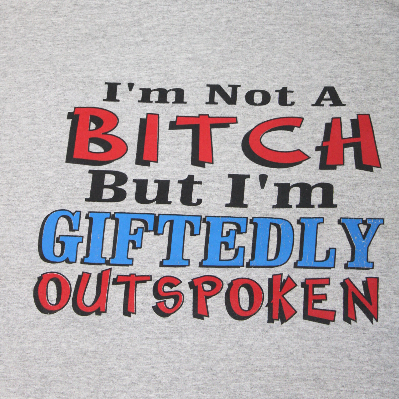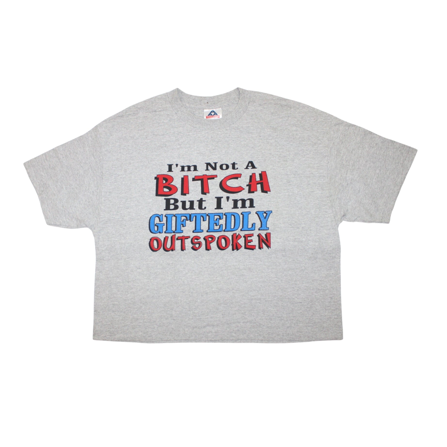 A bold and tongue-in-cheek graphic tee from the 2000s, this cropped cut features oversized red, blue, and black block lettering that declares “I’m Not A Bitch But I’m Giftedly Outspoken.” A perfect example of the playful, in-your-face humor style that was popular in early 2000s streetwear and novelty tees.