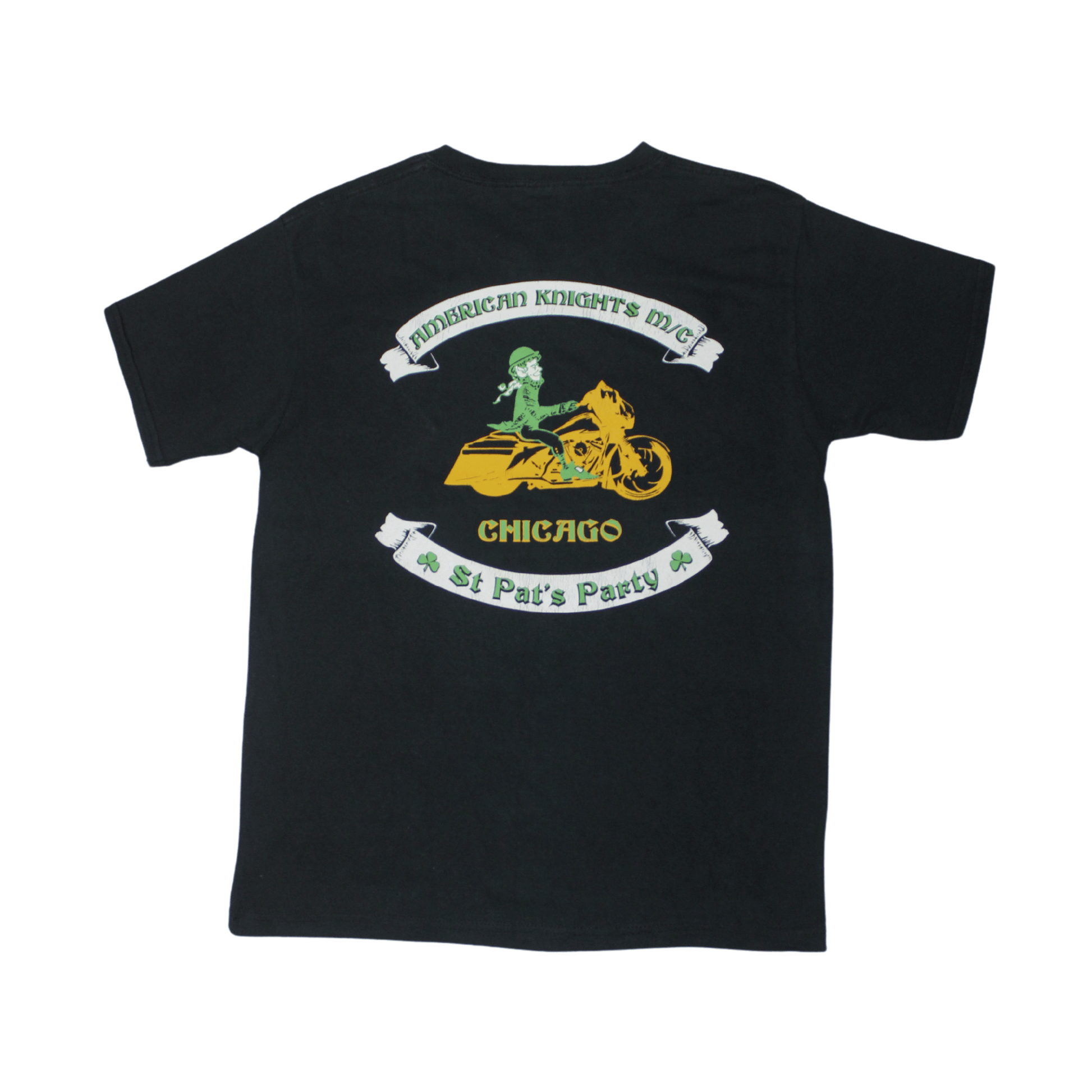 Details: Double-sided print with “American Knights M.C. Chicago” graphic and a leprechaun biker motif on the back. St. Patrick’s Day energy with bold yellow and green hits.