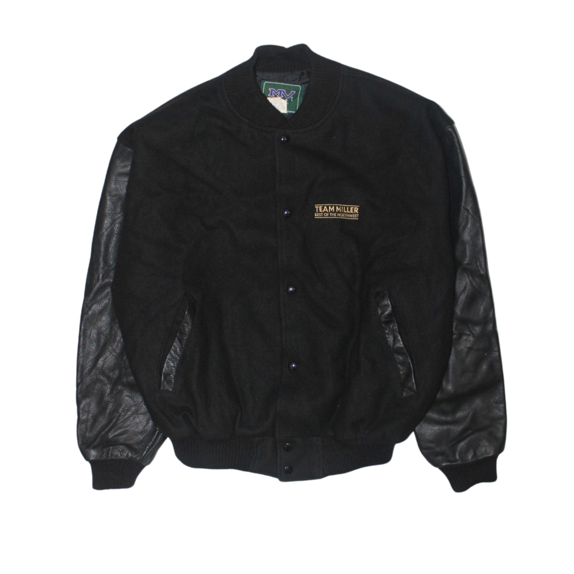 Details: Black wool body with black leather sleeves, embroidered “TEAM MILLER – Best of the Northwest” chest detail, snap-button front, leather-trimmed welt pockets, ribbed collar/cuffs/hem, plain back, fully lined, heavyweight build
