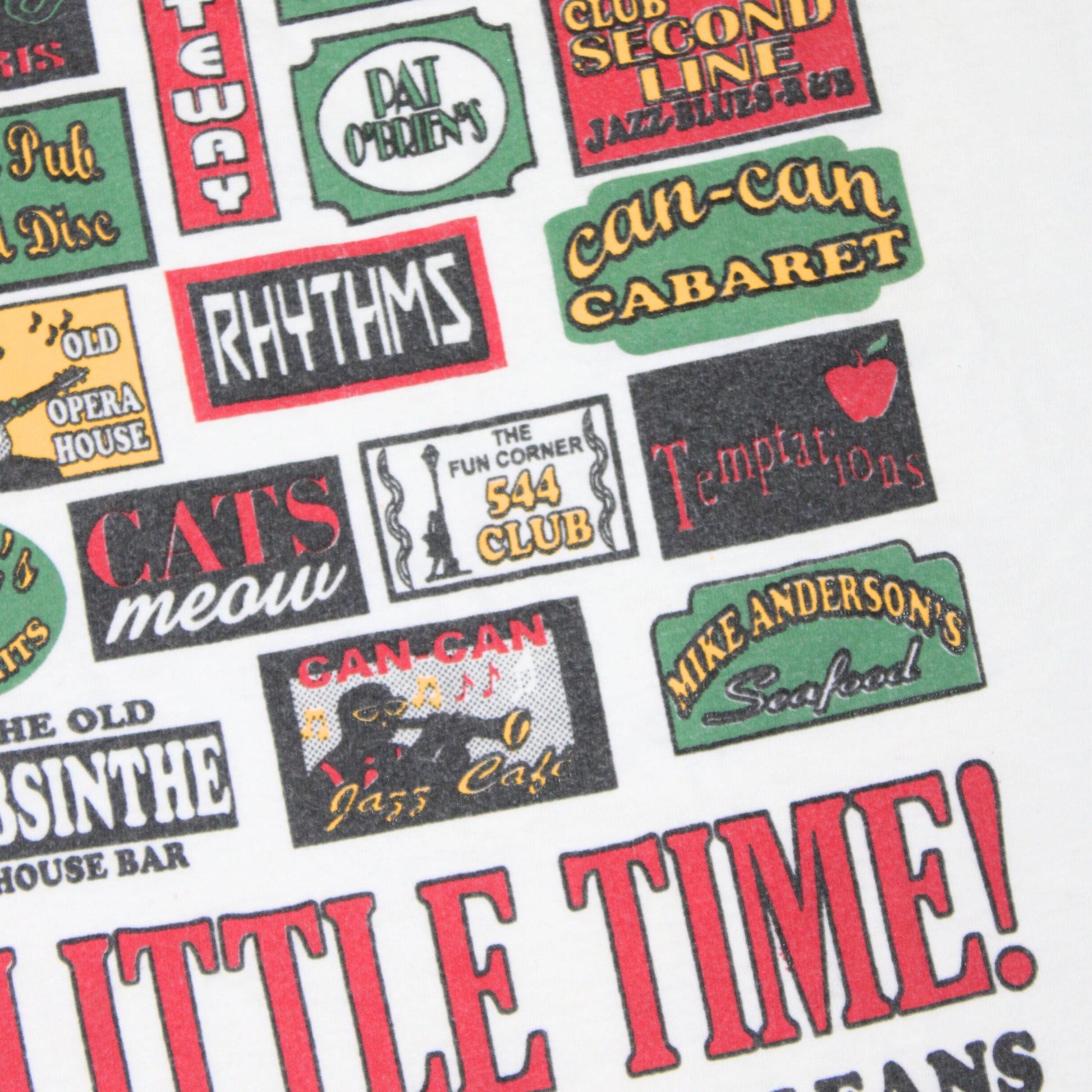 Tourist-core at its best — a New Orleans souvenir tee featuring a stacked list of iconic bars from Bourbon Street.