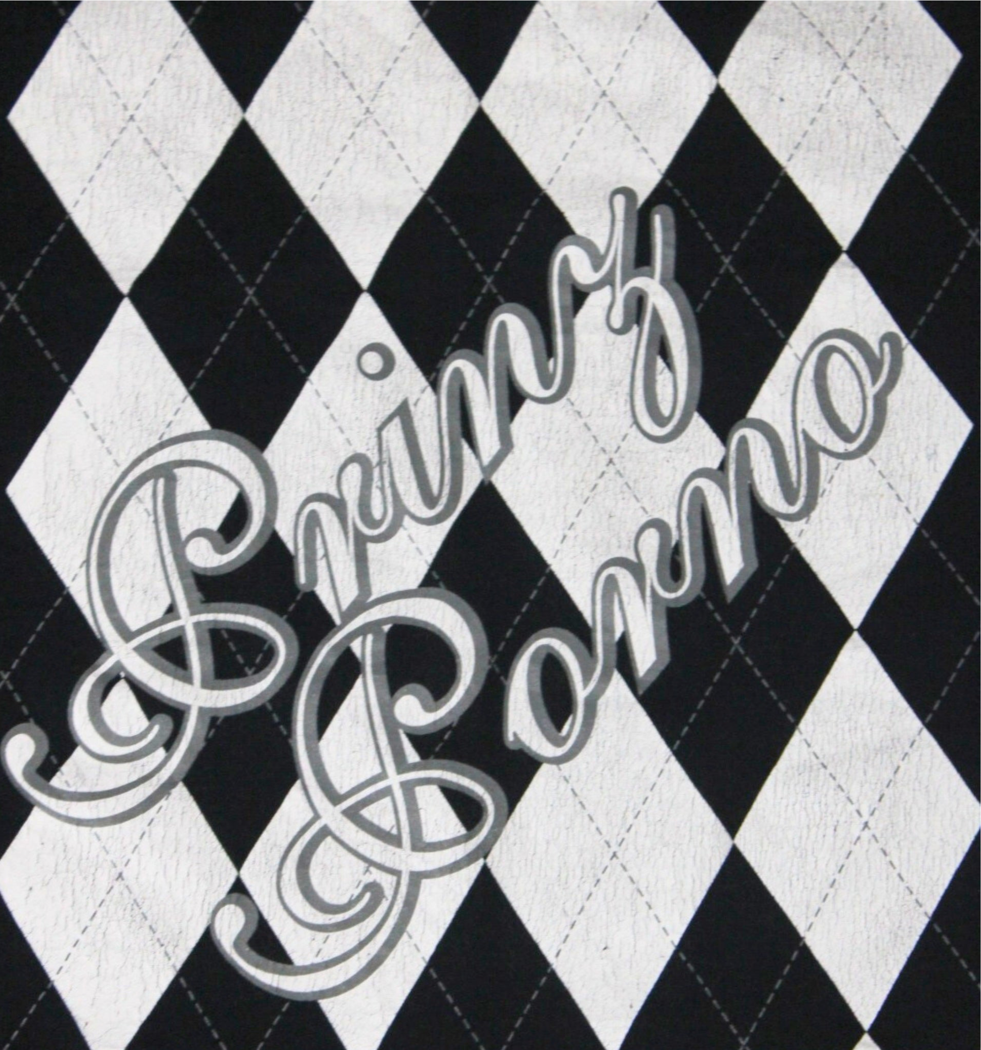 Details: Black tee with large centered white and grey diamond argyle pattern, overlayed with cursive text print.
