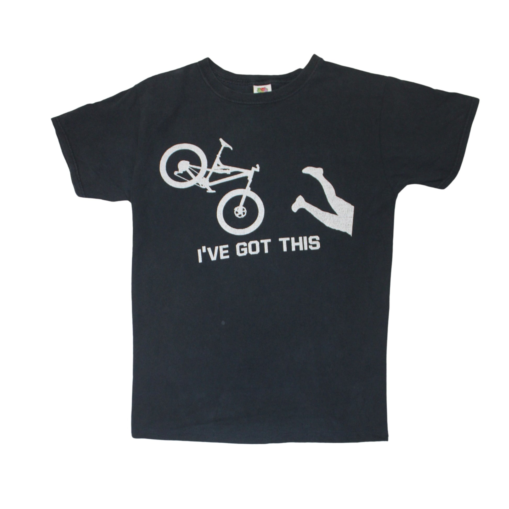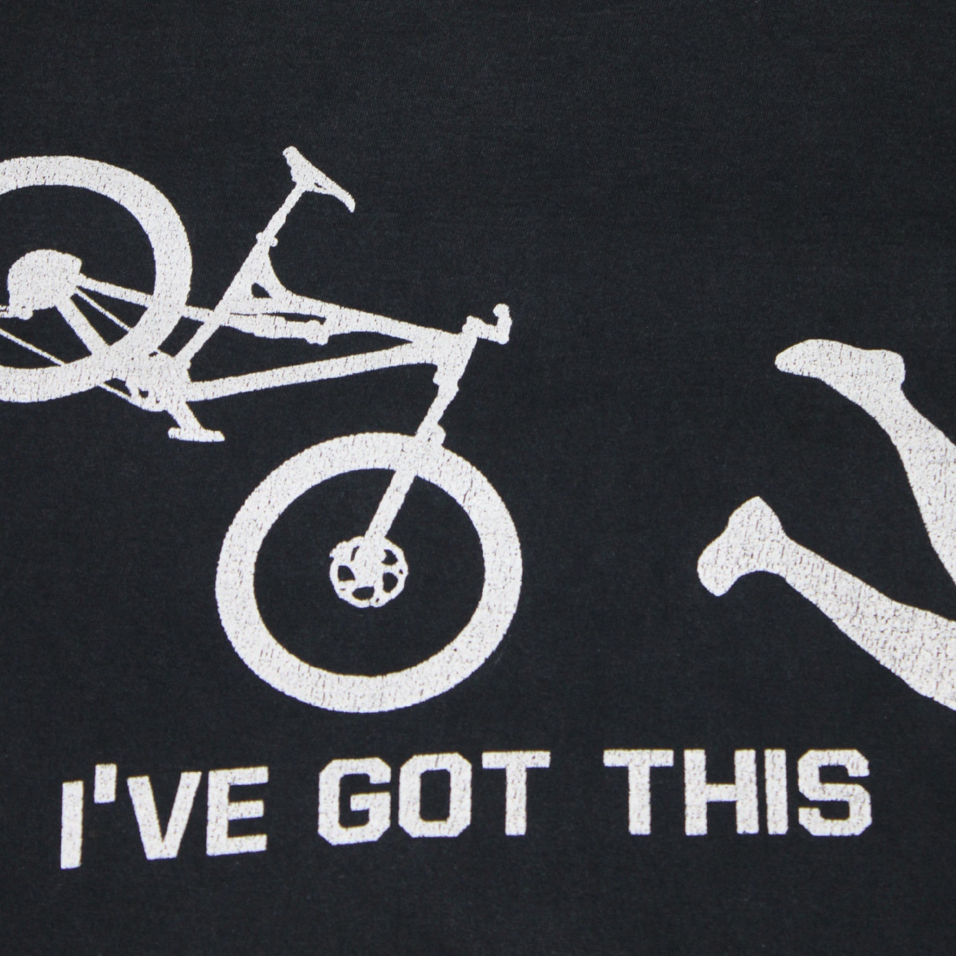 Graphic tee featuring a mid-air bike crash and the ironic caption “I’ve Got This” — peak chaotic energy.
