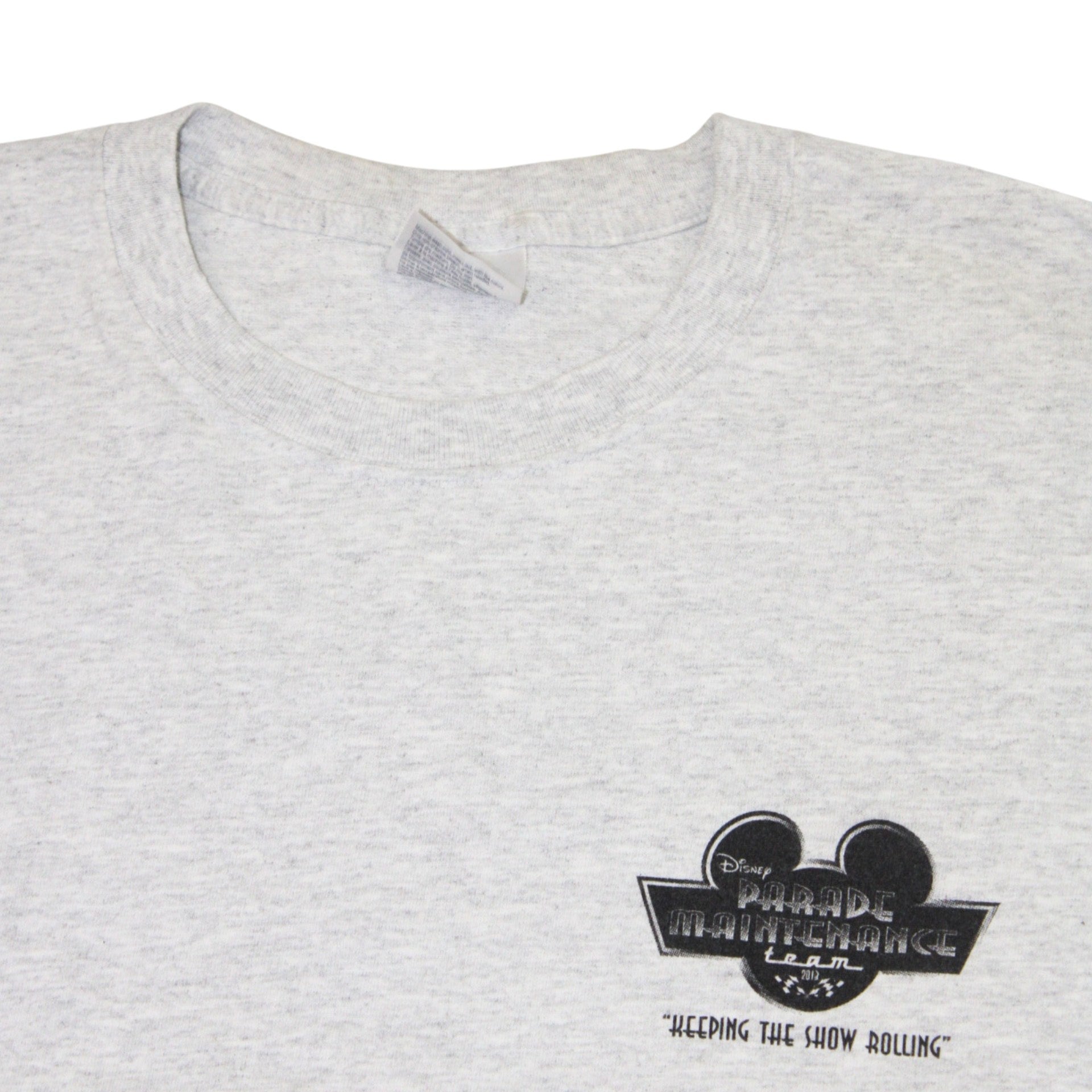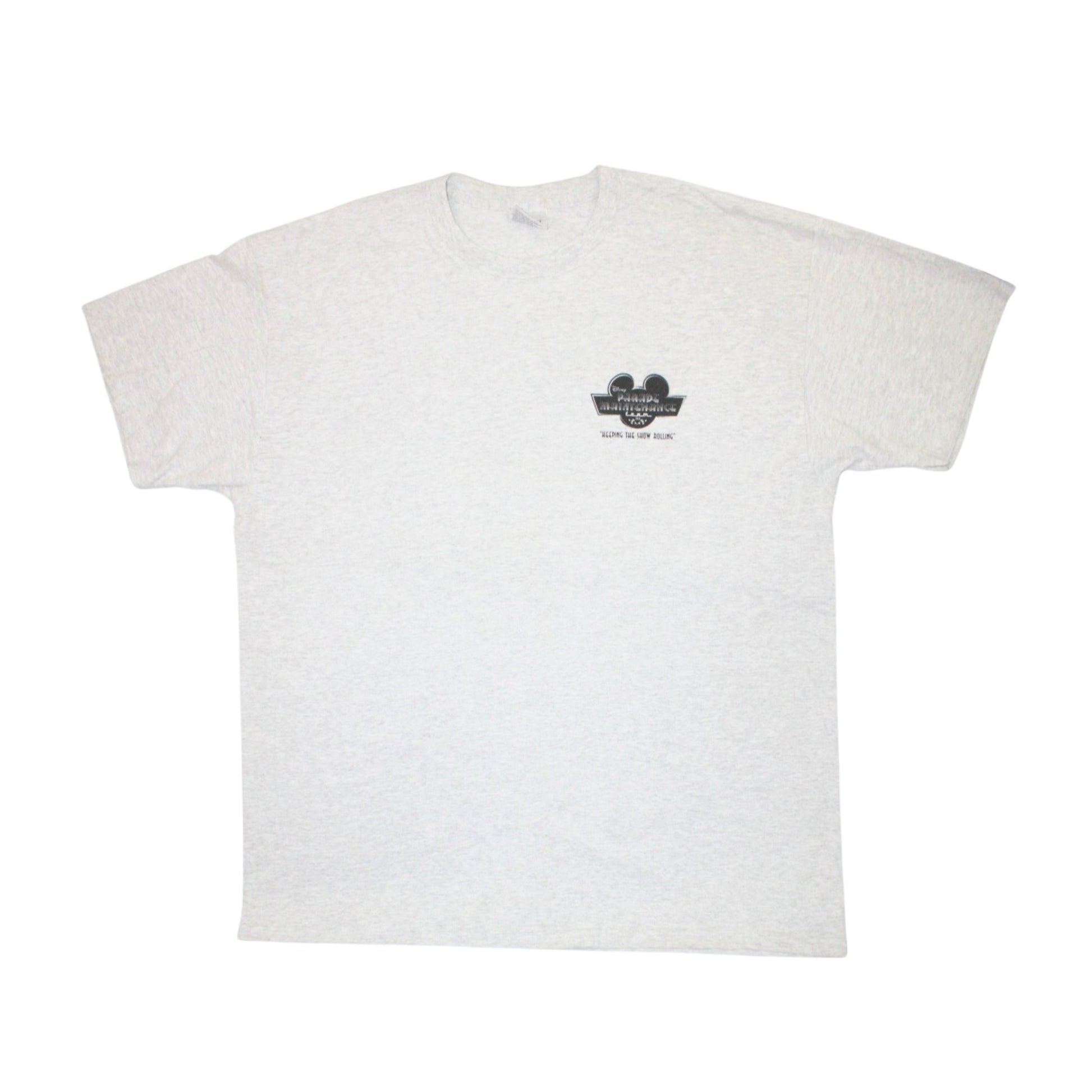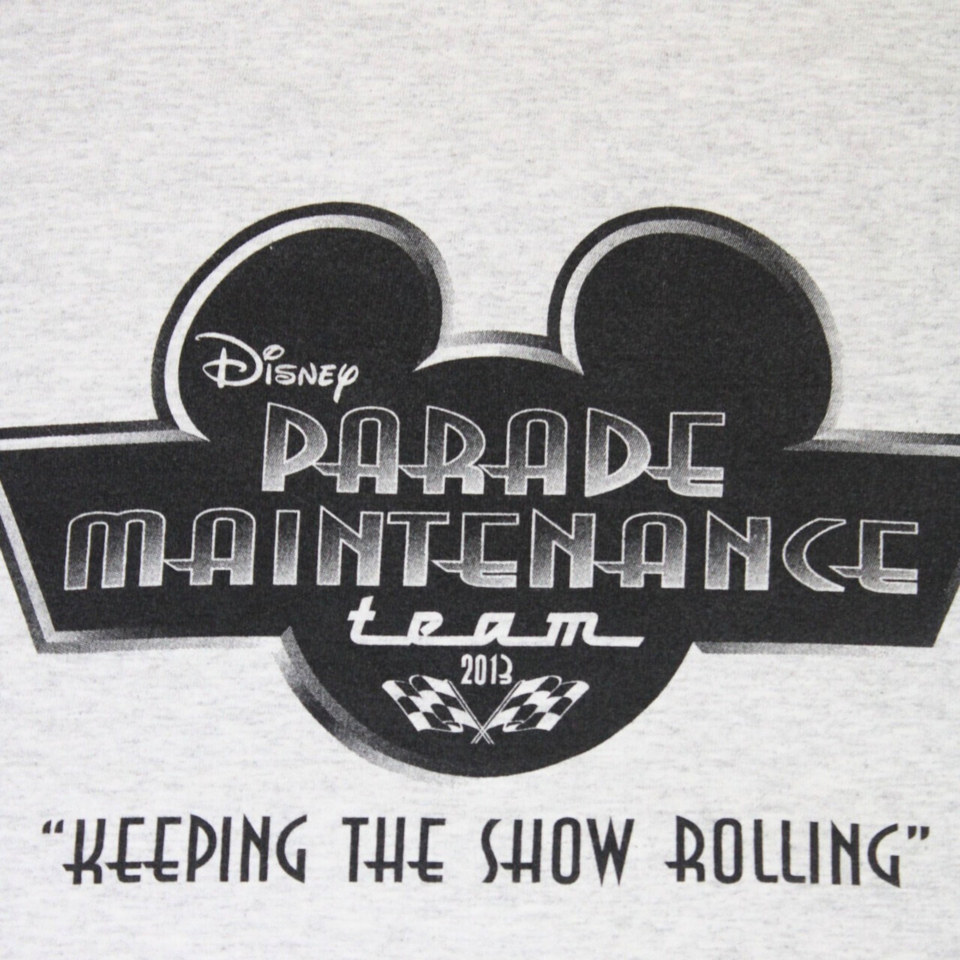 Details: Grey tee with front print featuring Disney’s Parade Maintenance Team logo, Mickey silhouette, and checkered flags. Plain back.