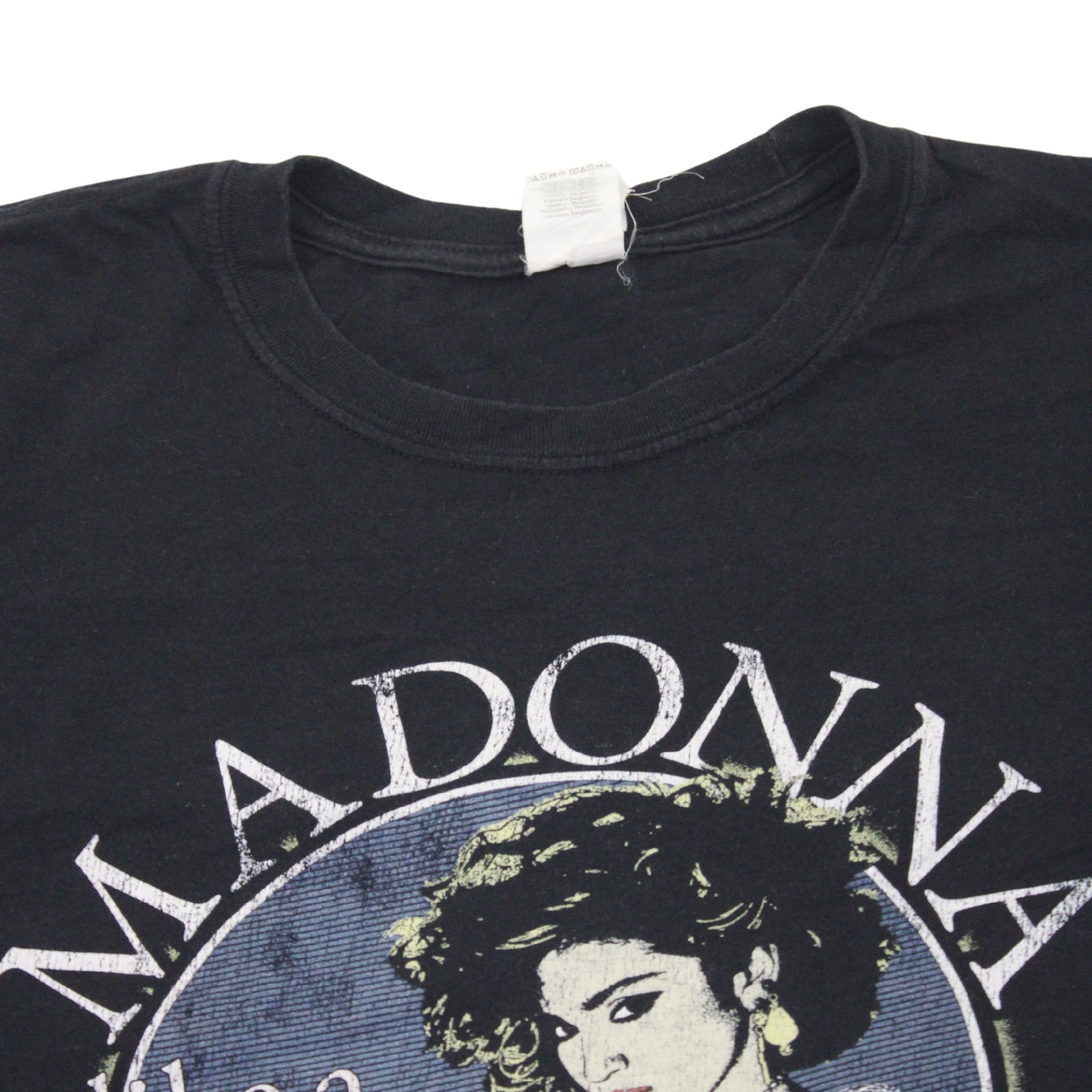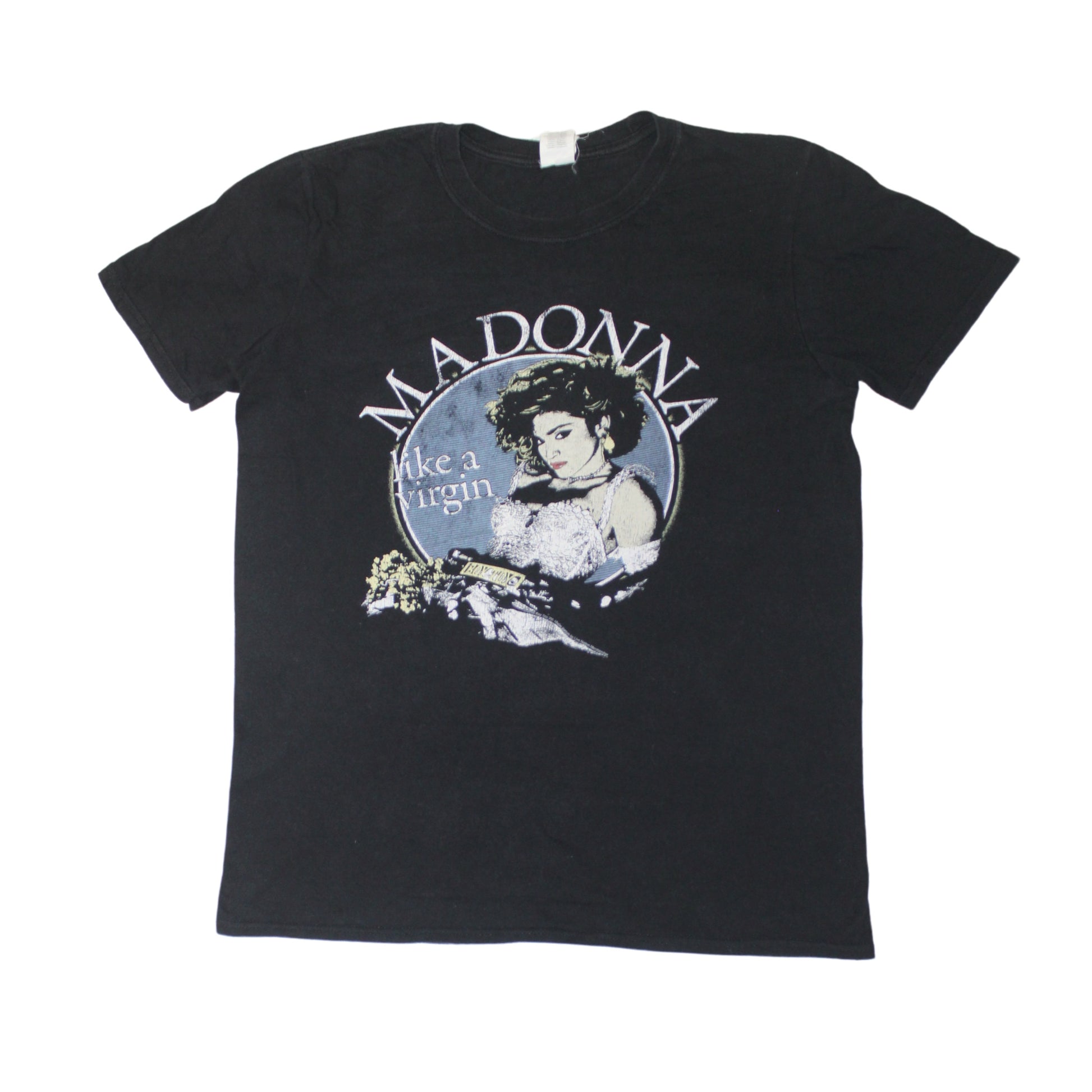 Tribute tee to the Queen of Pop — featuring her iconic Like a Virgin era look with soft vintage wash. Clean black base with no back print.