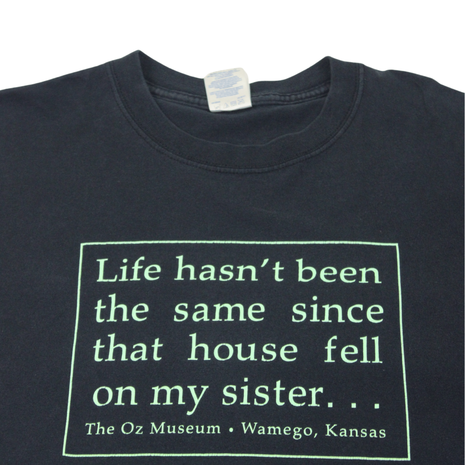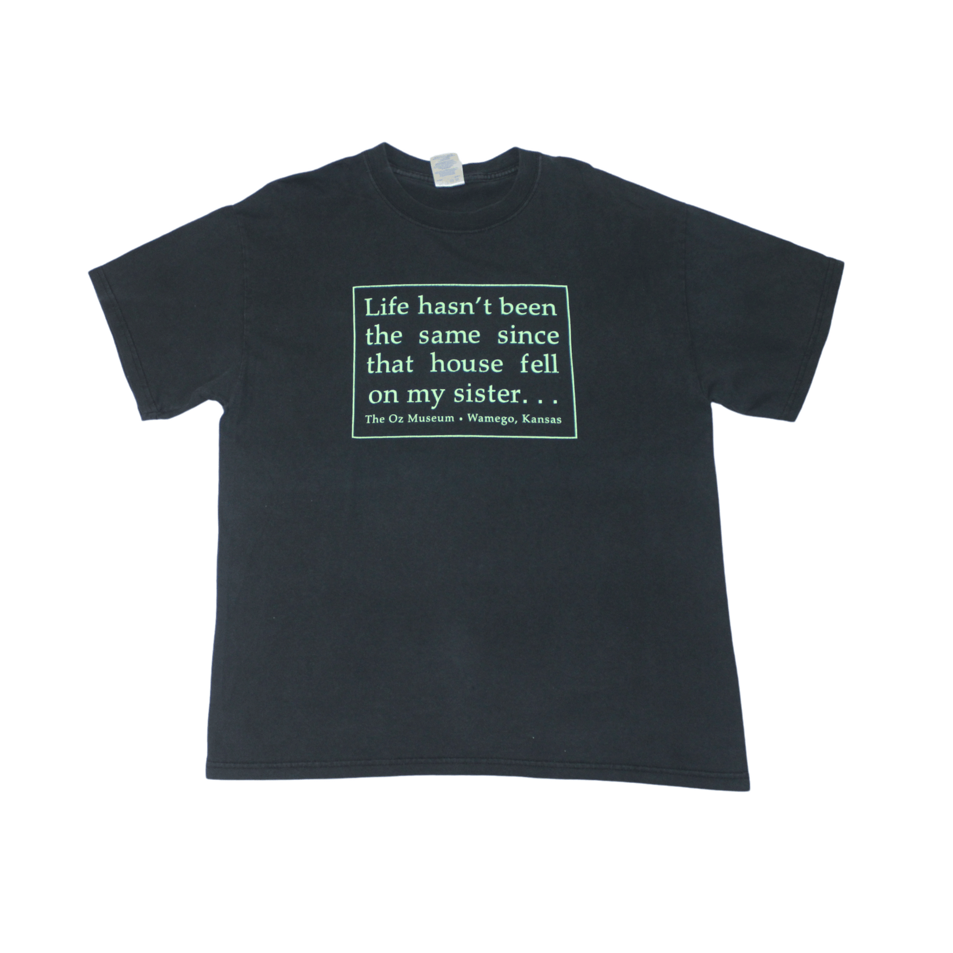 A rare and witty souvenir tee from The Oz Museum in Wamego, Kansas — a tribute to The Wizard of Oz. The front graphic reads "Life hasn’t been the same since that house fell on my sister...", a tongue-in-cheek reference to the Wicked Witch of the East. Perfect for Oz collectors or anyone into cult humor tees with a vintage tourism twist.