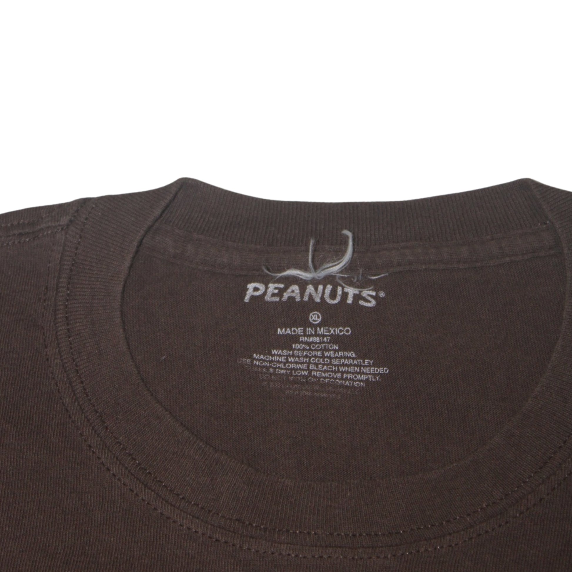 Details: Brown tee with central Halloween-themed print featuring Snoopy, Charlie Brown, Lucy, and ghosts.