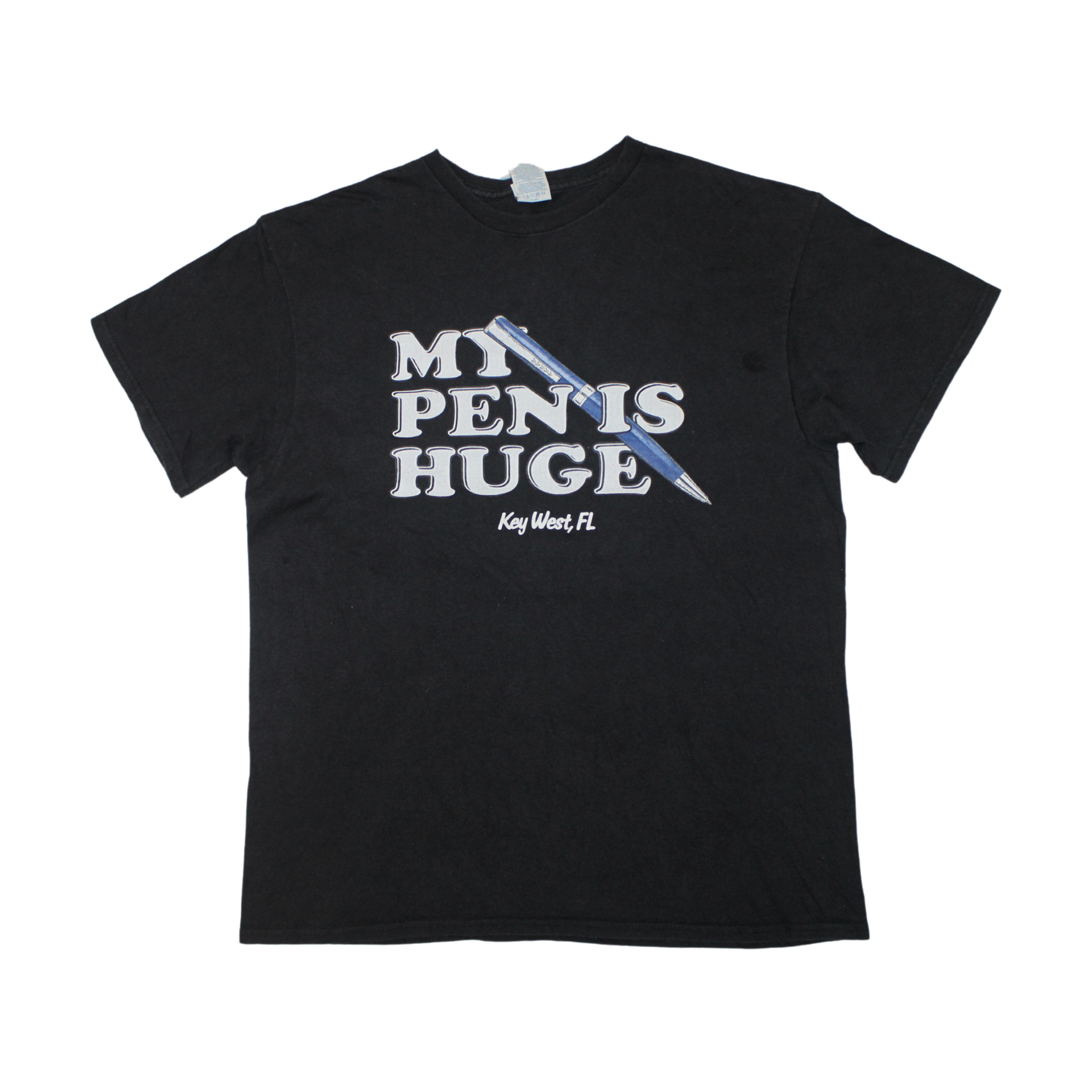 Details: Front graphic only. Reads “MY PEN IS HUGE – Key West, FL.” Soft cotton with a sun-faded black base.