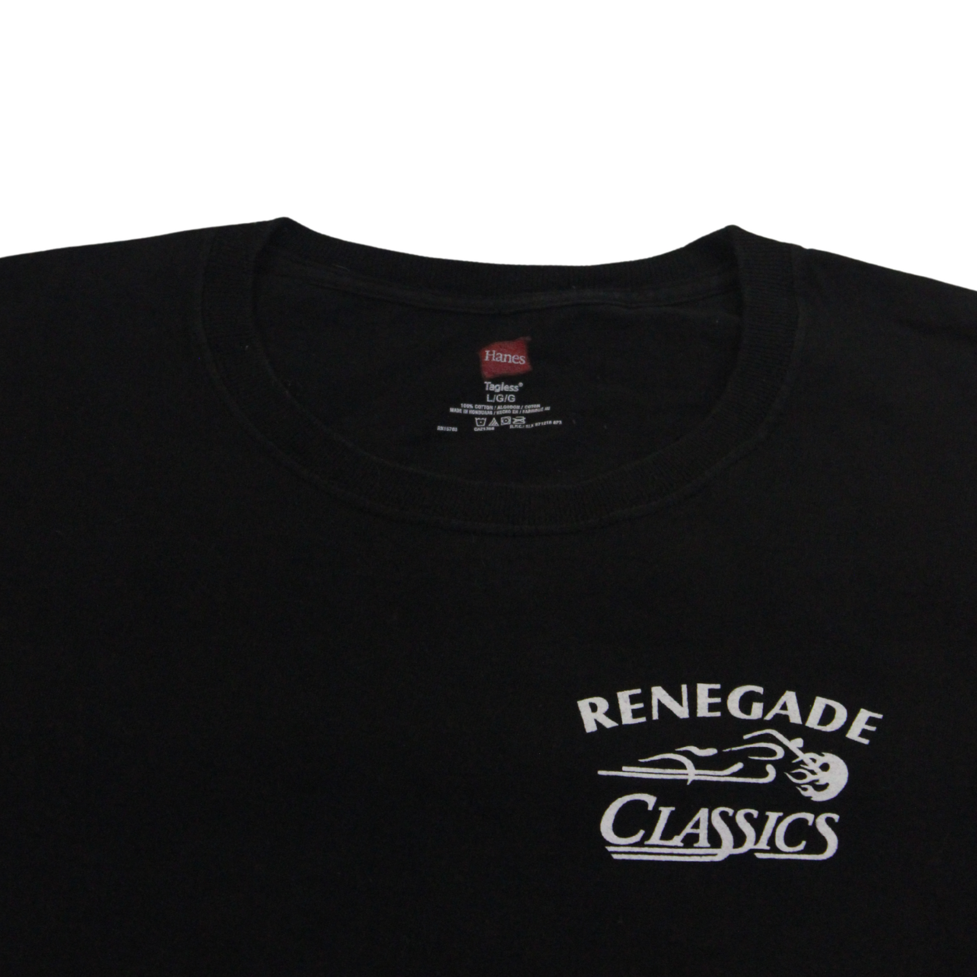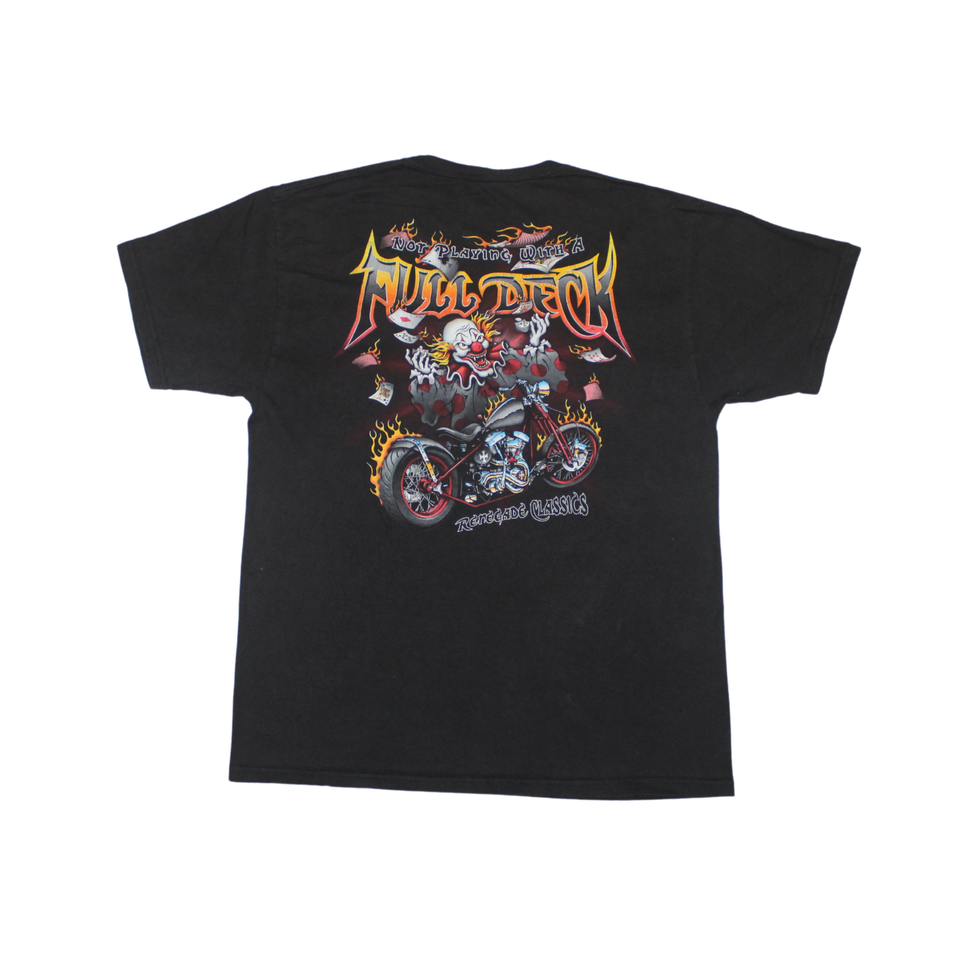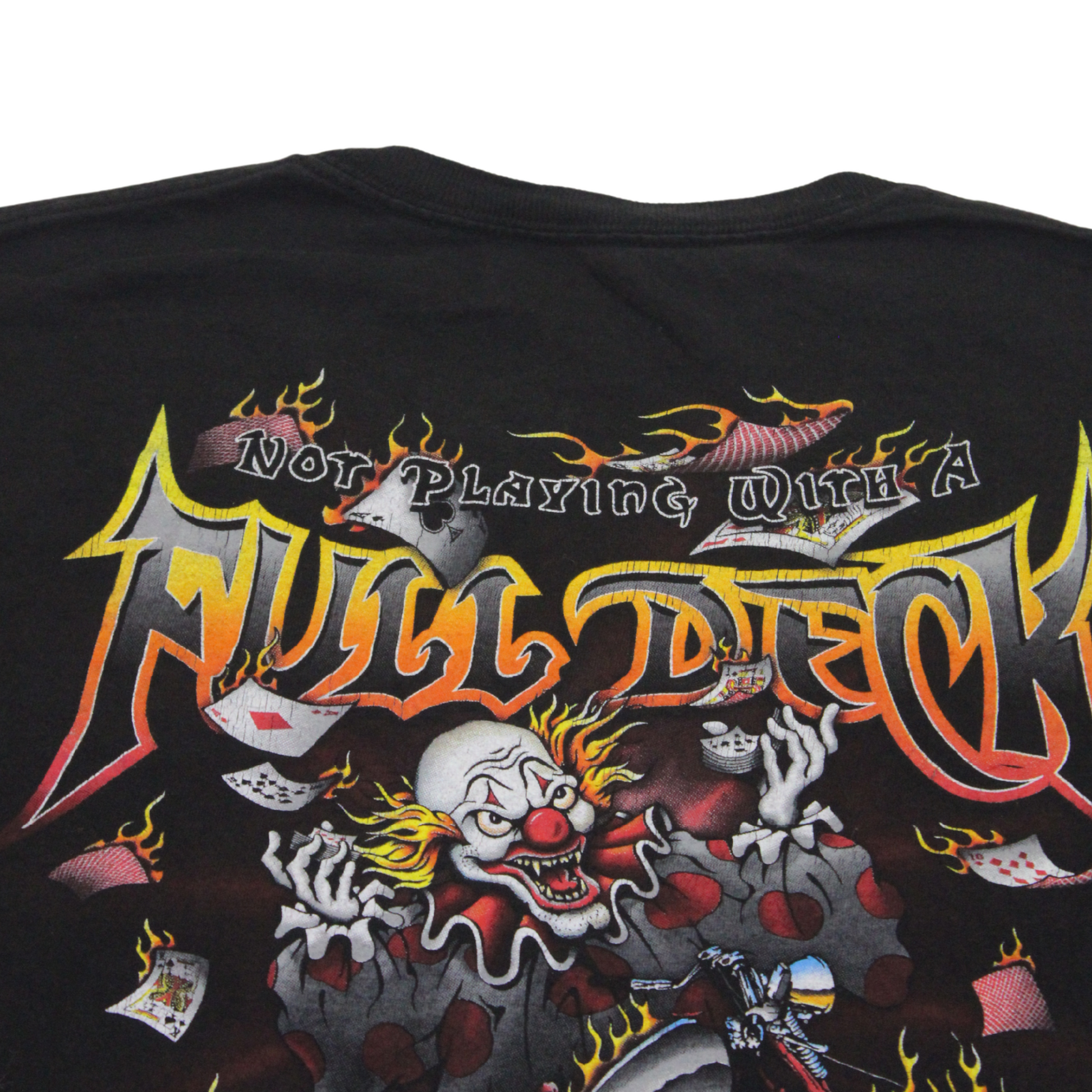 Details: Small front logo hit, oversized graphic on back with clown and motorcycle.