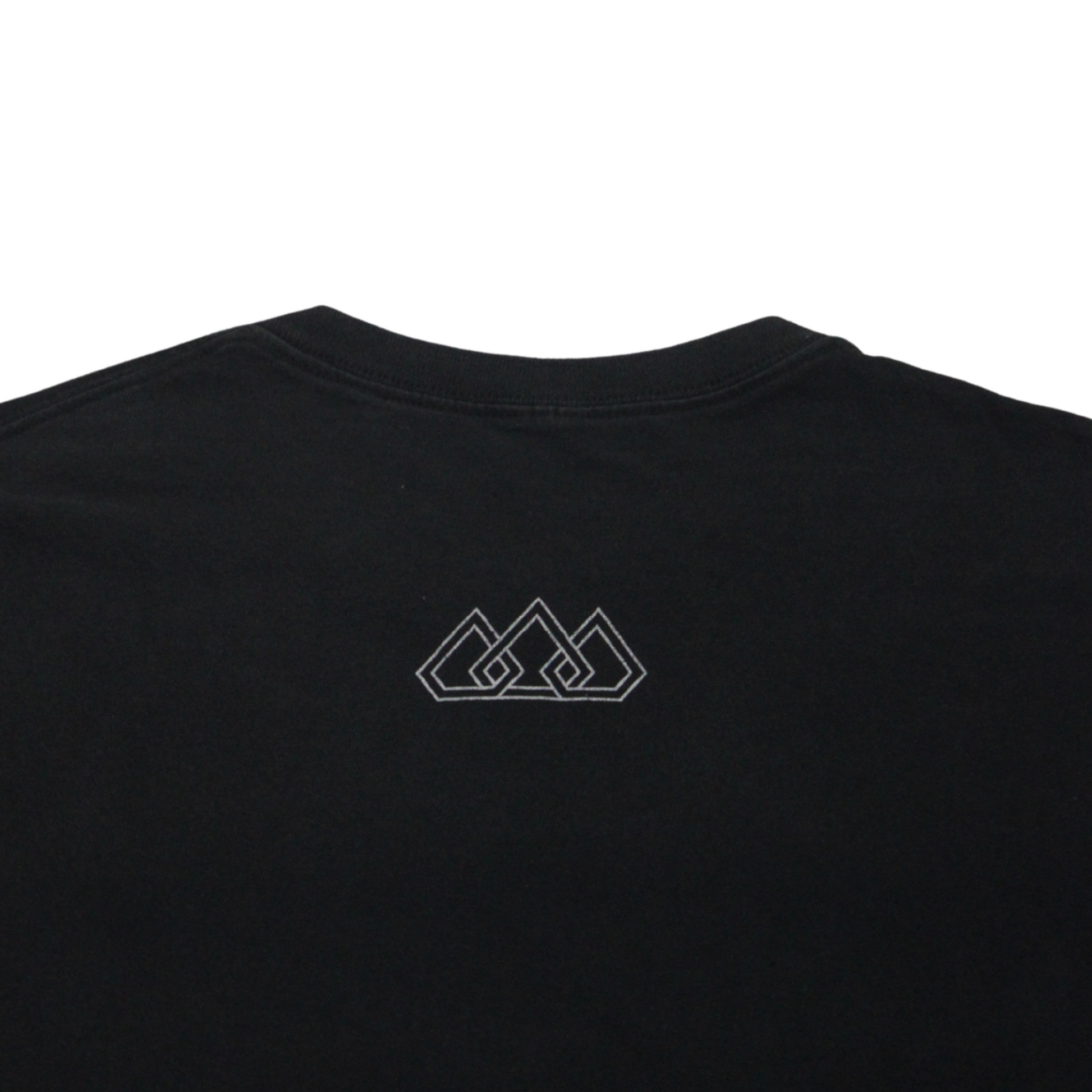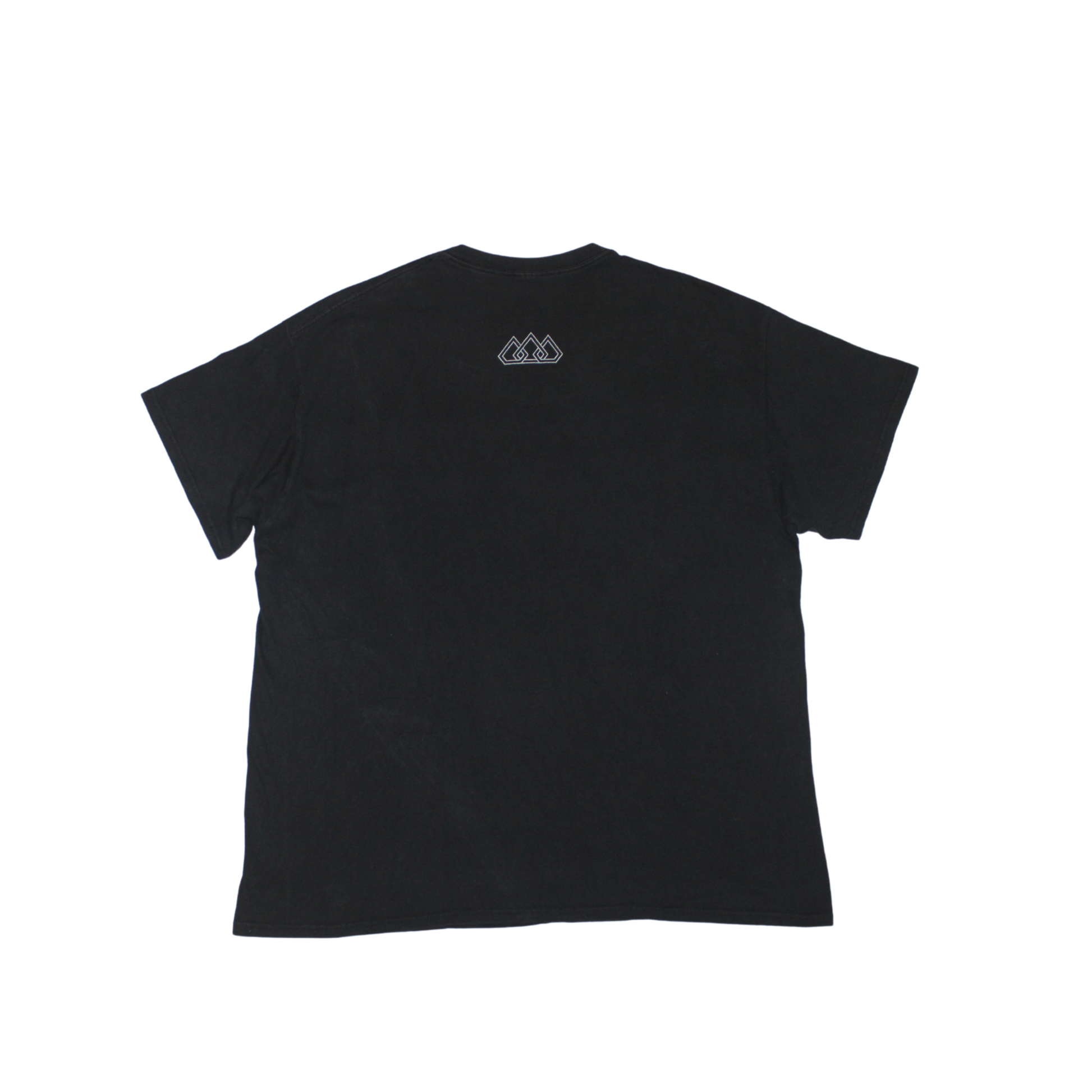 Details: Bold circular logo print on front, small icon logo on back neck. Nicely faded.