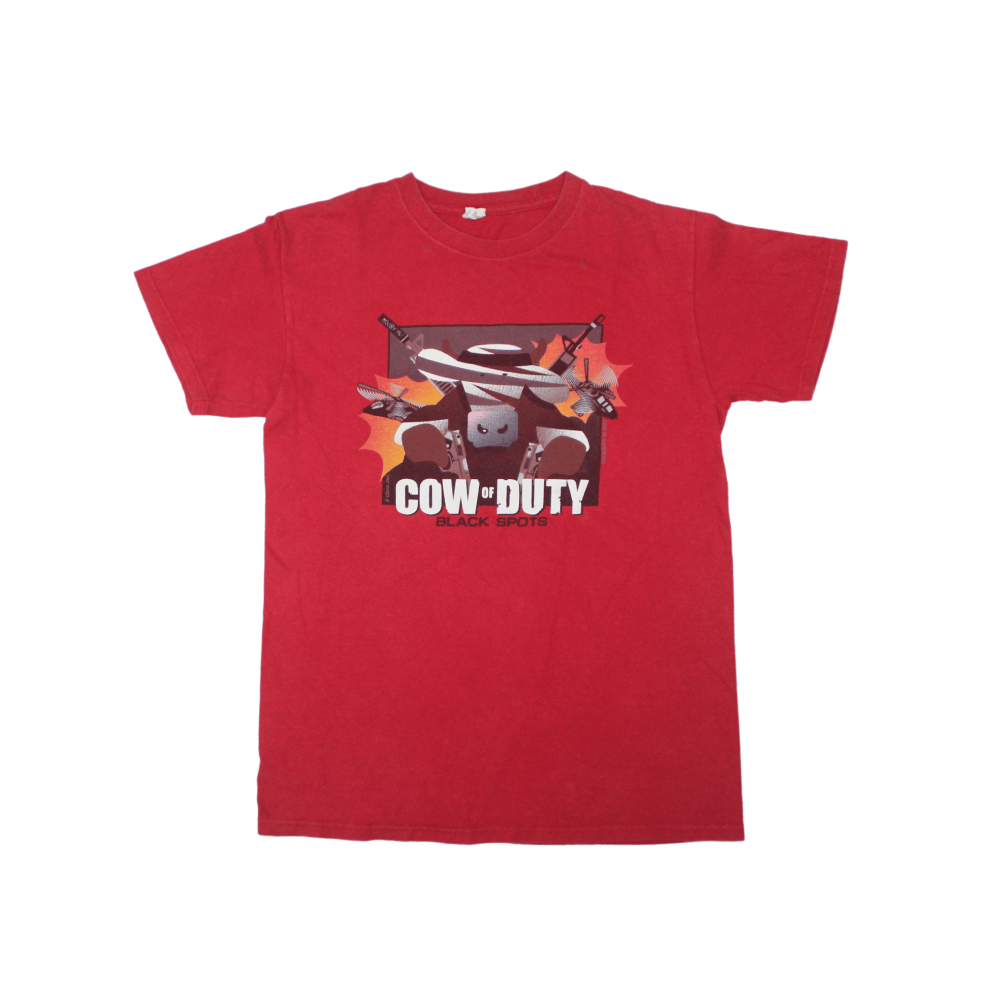 Parody meets combat in this bold red tee riffing on the iconic Call of Duty franchise — reimagined with a cow at war, twin pistols in hoof, and a comic explosion of chaos.