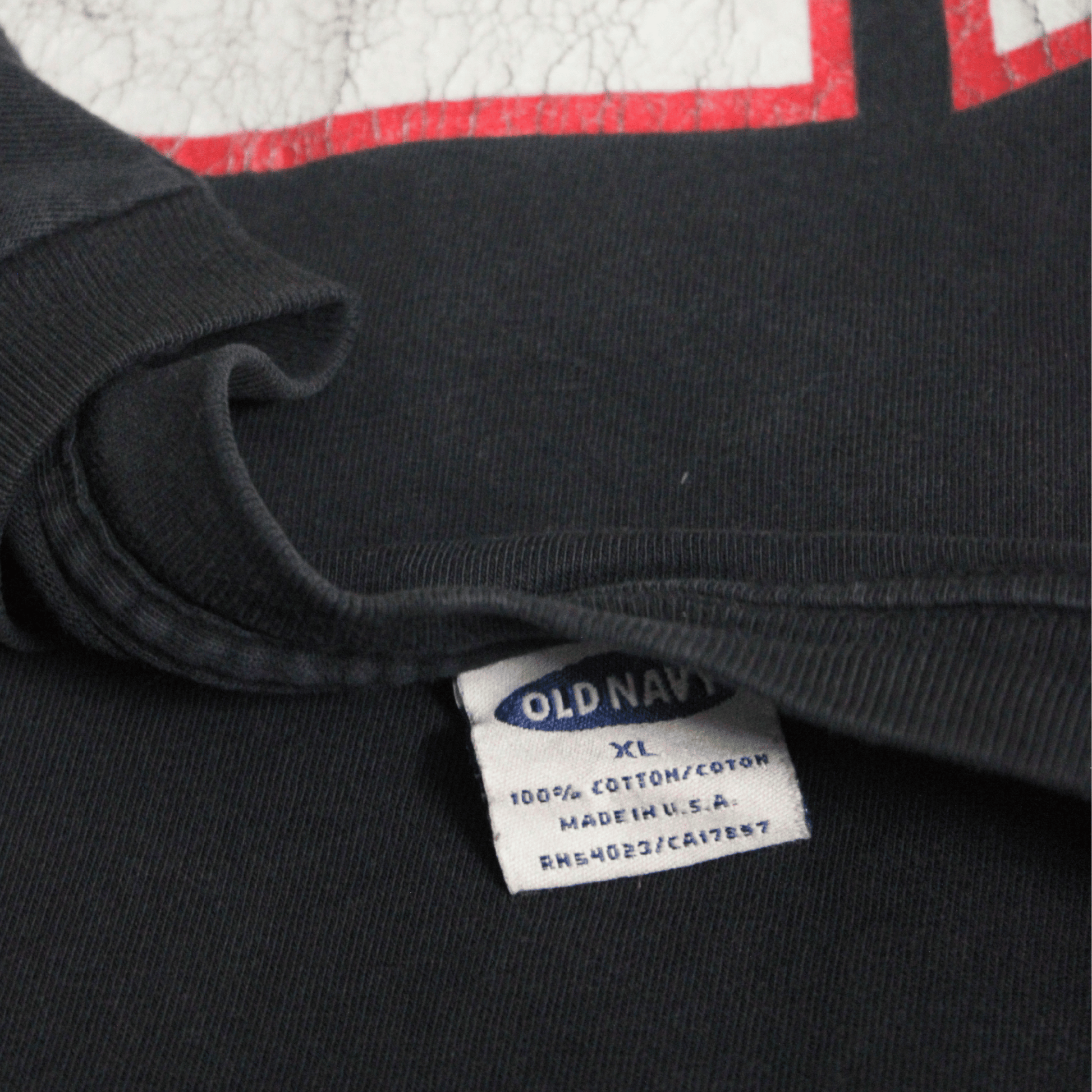 Well-worn and perfectly faded Old Navy tee with crack print on both sides — aged to perfection.