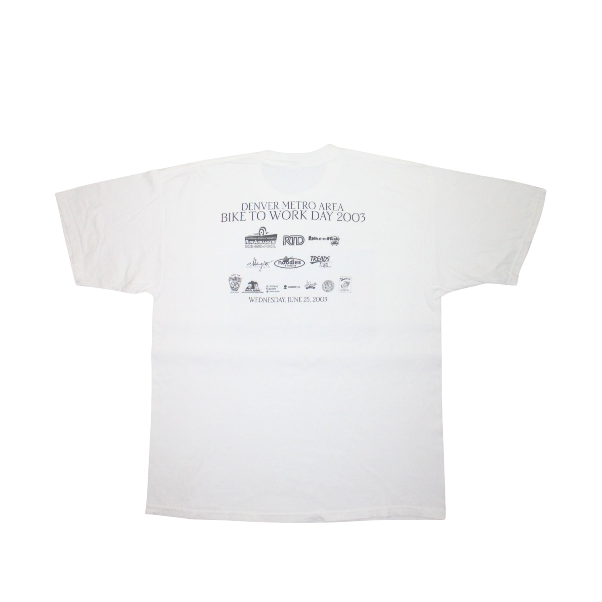Commemorative event tee from Denver’s 2003 “Bike to Work Day,” featuring a colorful watercolor-style illustration of cyclists and pedestrians in a charming downtown scene by artist Barbara Froula. Back print lists participating sponsors, including local businesses, transport services, and event partners. A piece celebrating community spirit, sustainable commuting, and early 2000s design.